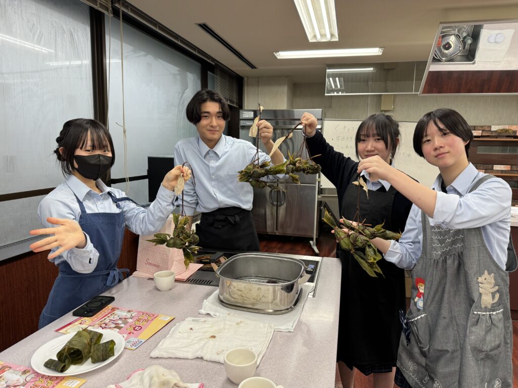 包餡(餡を包んでいく作業)の技術に苦戦しながらも、新潟伝統の和菓子笹団子とチョコバナナのコラボレーションは、試食でも全員が満足した味に仕上がりました。今後、販売に向けてさらに探究が続きます。